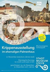 Das Stadtmuseum Steyr zeigt vom 21. November 2025 bis zum 6. Jänner 2026 im ehemaligen Palmenhaus im Schlosspark Steyr eine erlesene Krippenausstellung. Die kostenlos zugängliche Ausstellung zeigt zwei beeindruckende Großkrippen.