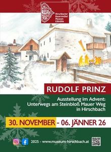 Das Hirschbacher Bauernmöbelmuseum zeigt vom 30. November 2025 bis zum 6. Jänner 2026 die Ausstellung Rudolf Prinz. Unterwegs am Steinbloß Mauer Weg in Hirschbach.